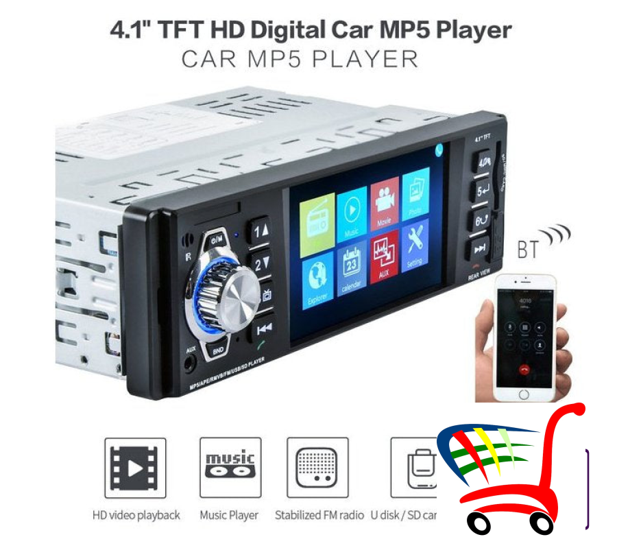 AUTO RADIO Multdija sa ekranom dijagonale od * 4,1 * inca na kojoj mozete slusati muziku, gledati filmove, spotove, razgovarati mobilnim telefonom preko blututa. . Ulaz je dgovarajuci za sve automobile koji imaju standardan ulaz za radio.