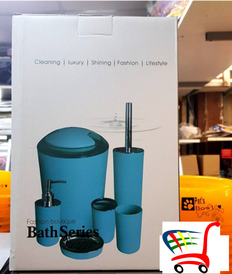 Set se sastoji od kante za smeće, toaletne četke, posude za sapun, posude za tečni sapun, čaše za četkicu za zube, i i držača za četkice za zube.