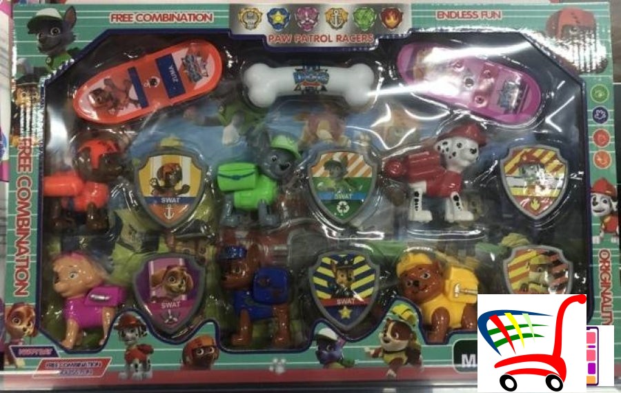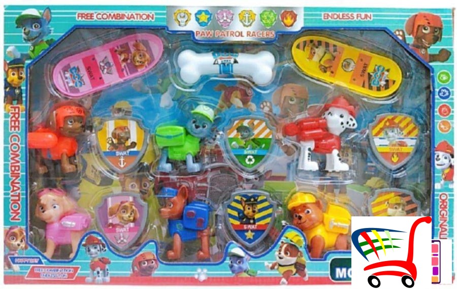 Patrolne šape set 6 u1 figura sa skejtom i bedževima
