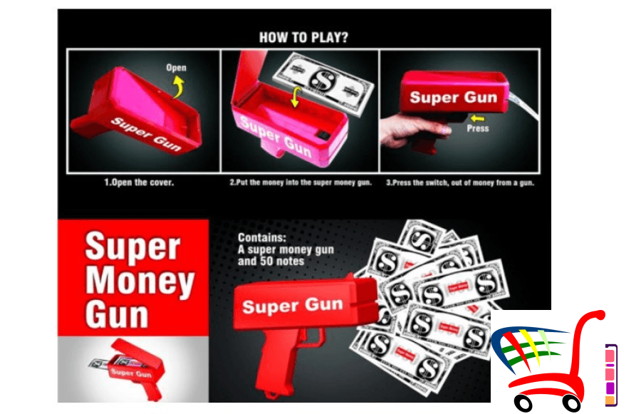 Vrhunska zabava u bilo kom pogledu. U pištolj možete ubaciti do 100 novčanica i zabava može početi. Potrebno je kupiti samo baterije za pištolj.