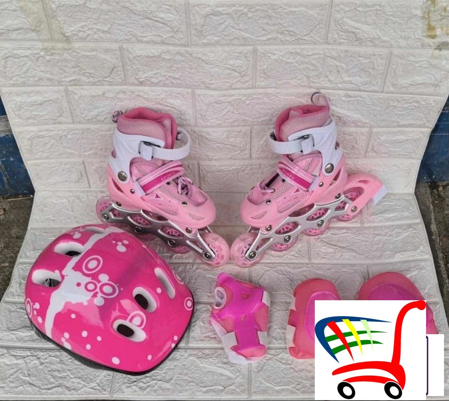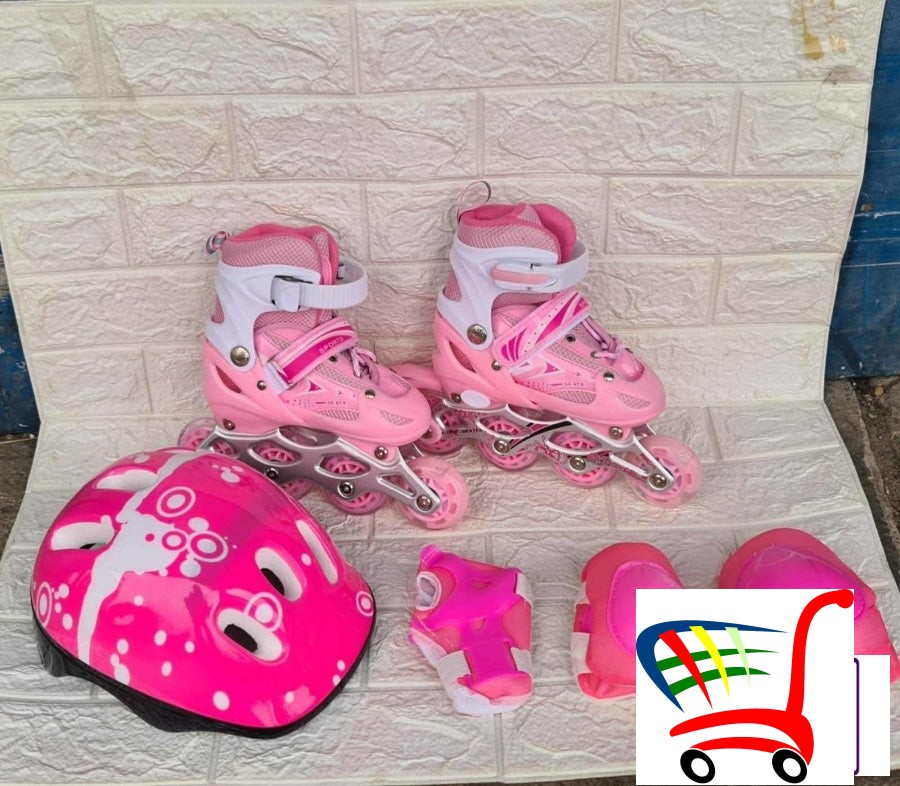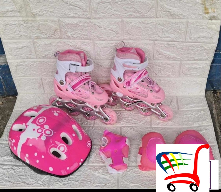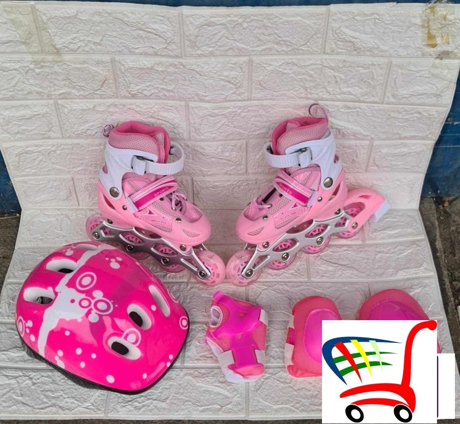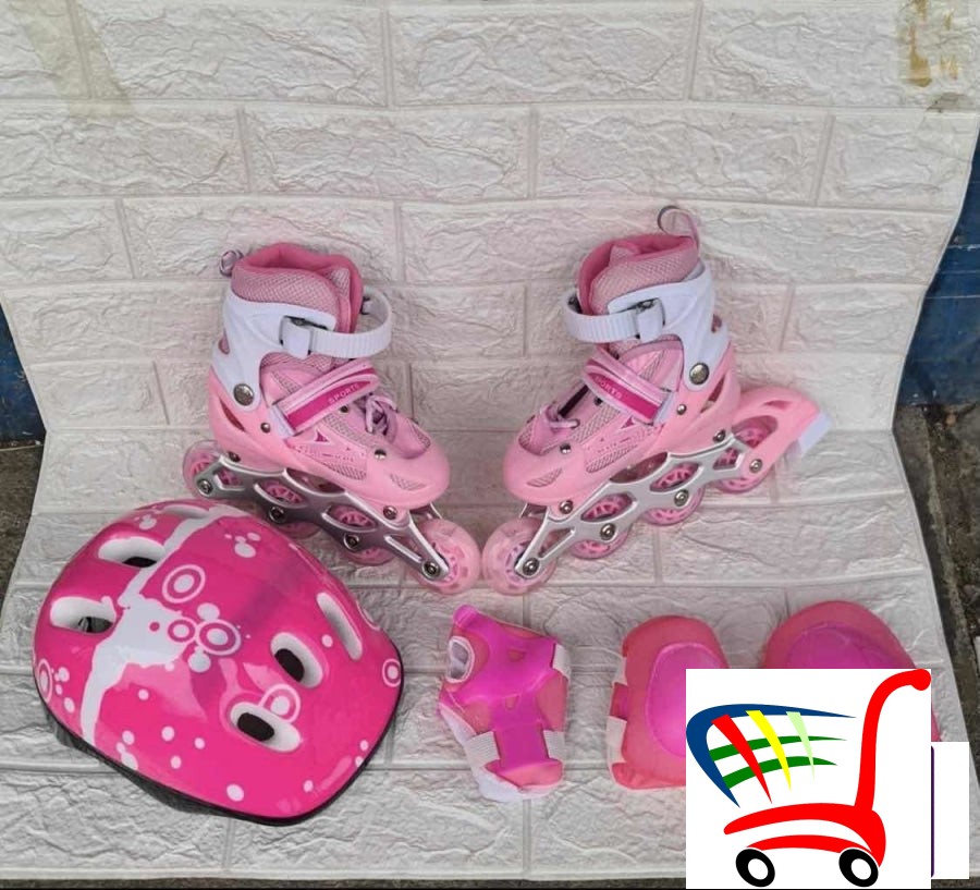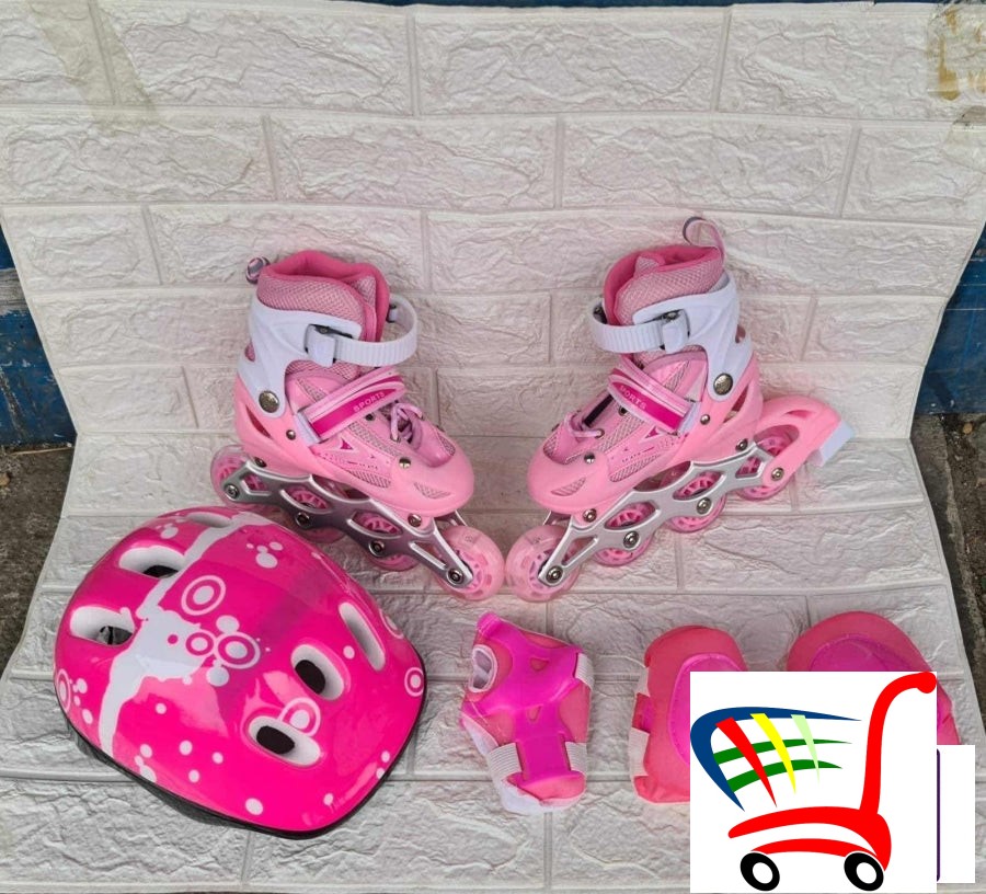 roleri sa štitnicima ( za laktove, kolena i dlanove ) i kacigom u istim bojama – 4000. Din