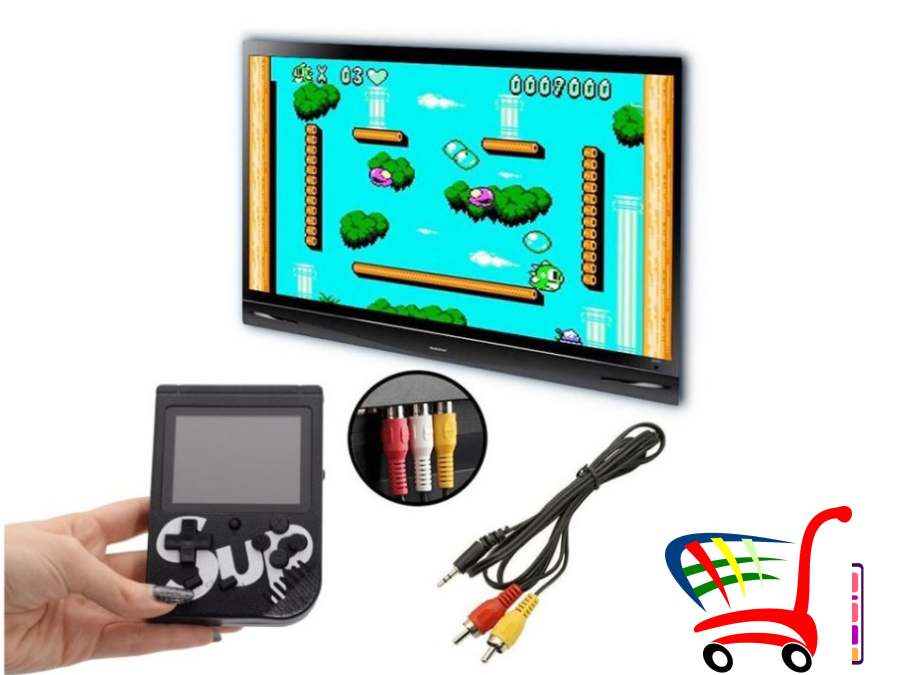 Sup 400 igrica u konzoli. U pitanju su starije igrice poput super marija. Uz konzolu dobijate i kablove za tv, mozete povezati tv sa kablovima.